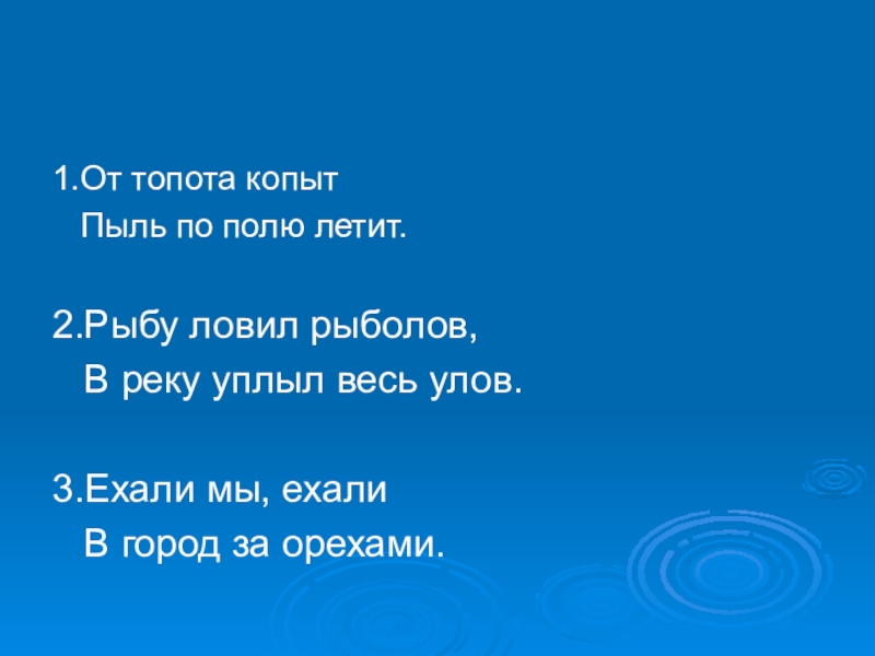 1.От топота копыт  Пыль по полю летит.2.Рыбу ловил рыболов,  В реку уплыл весь улов.3.Ехали мы,