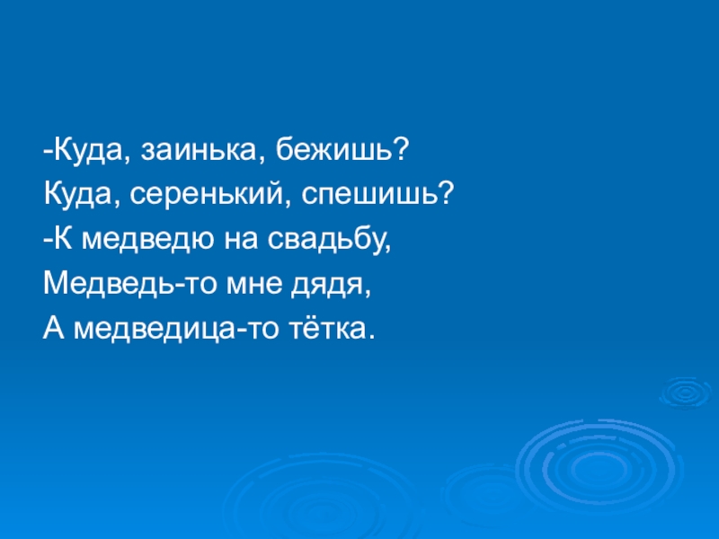 -Куда, заинька, бежишь?Куда, серенький, спешишь?-К медведю на свадьбу,Медведь-то мне дядя,А медведица-то тётка.