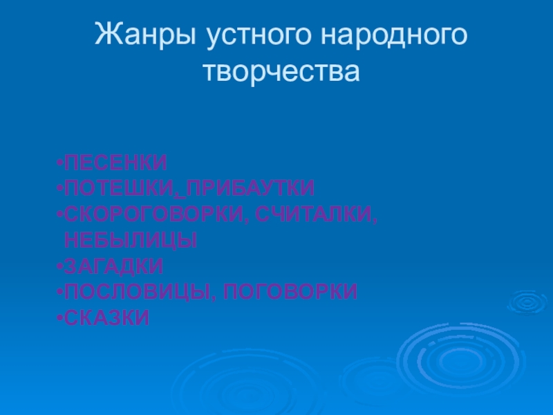 Жанры устного народного творчестваПЕСЕНКИПОТЕШКИ, ПРИБАУТКИ СКОРОГОВОРКИ, СЧИТАЛКИ, НЕБЫЛИЦЫЗАГАДКИПОСЛОВИЦЫ, ПОГОВОРКИСКАЗКИ