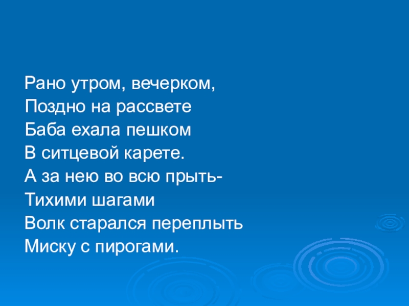 Рано утром, вечерком,Поздно на рассветеБаба ехала пешкомВ ситцевой карете.А за нею во всю прыть-Тихими шагамиВолк старался переплытьМиску