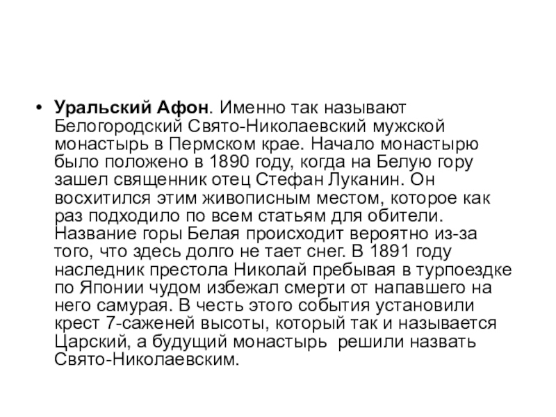 Презентация, доклад по внеклассному мероприятию Уральский Афон