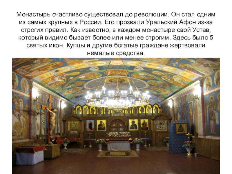 в России. Его прозвали Уральский Афон из-за строгих правил. Как известно, в каждом монастыре свой Устав, который видимо бывает более или менее строгим. Здесь было 5 святых икон. Купцы и другие богатые граждане жертвовали немалые средства.