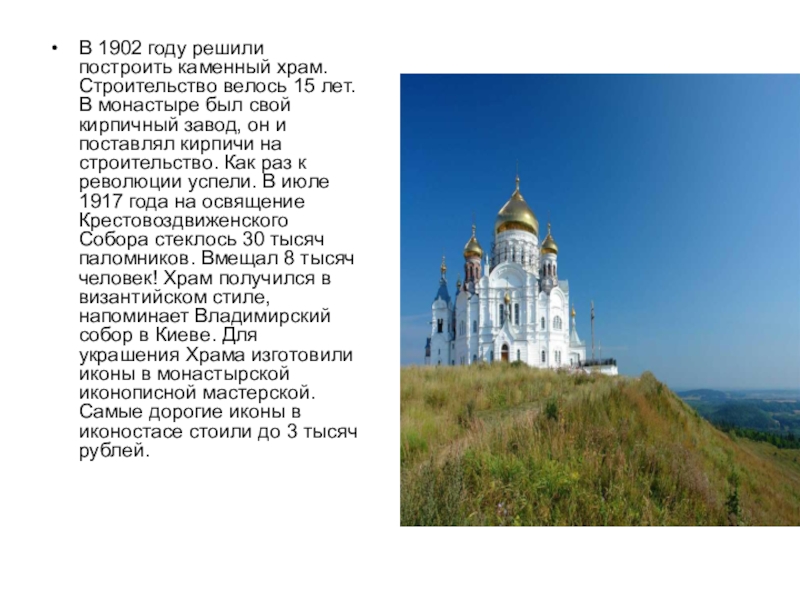 В 1902 году решили построить каменный храм. Строительство велось 15 лет. В монастыре был свой кирпичный завод,