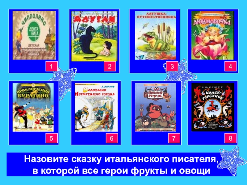 Кот в сапогахРусалочкаКрасная шапочкаЗолушка34444421Красная шапочкаКрасная шапочкаКрасная шапочкаКрасная шапочка8765Назовите сказку итальянского писателя,в которой все герои фрукты и овощи