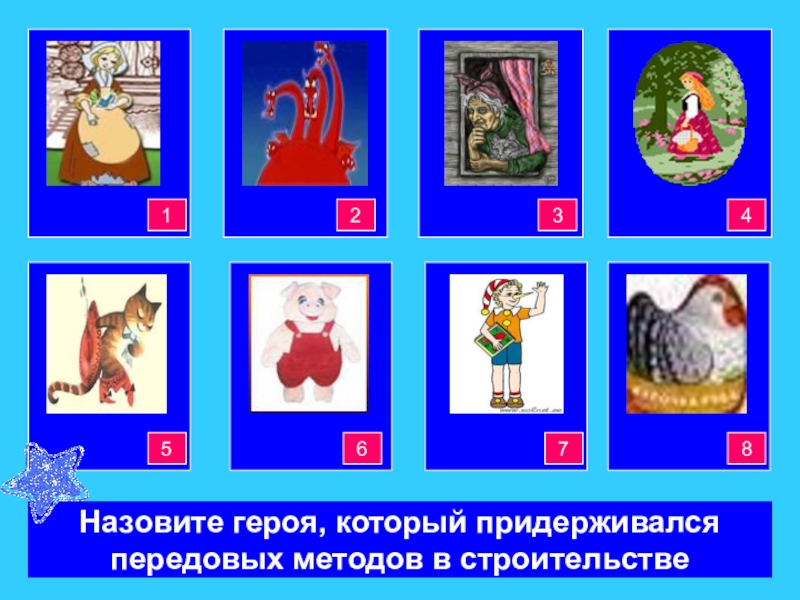Красная ШапочкаБаба-ЯгаЗолушка34444421Кот всапогахНаф - НафБуратино8765Назовите героя, который придерживалсяпередовых методов в строительстве