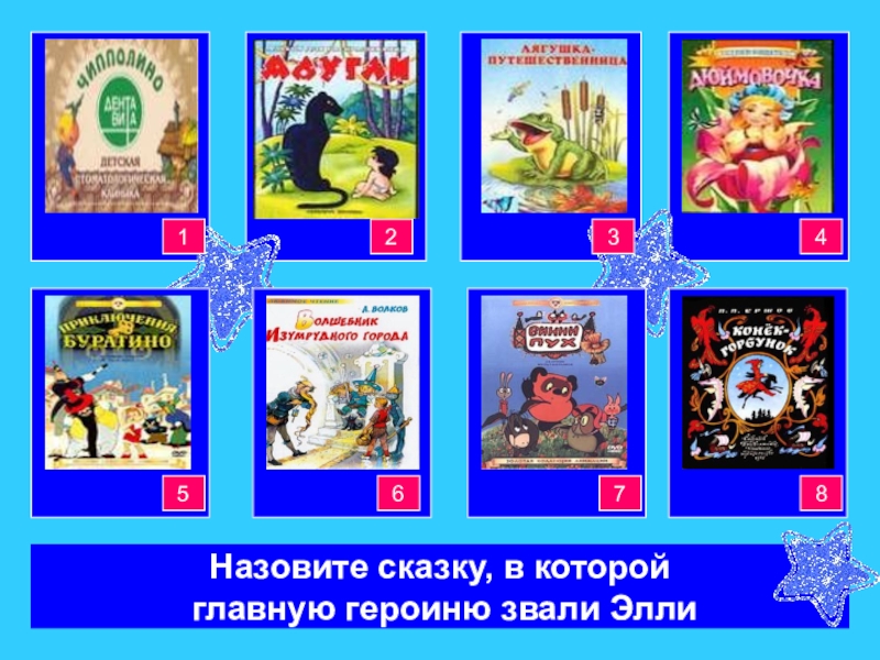 Кот в сапогахРусалочкаКрасная шапочкаЗолушка34444421Красная шапочкаКрасная шапочкаКрасная шапочкаКрасная шапочка8765Назовите сказку, в которой главную героиню звали Элли
