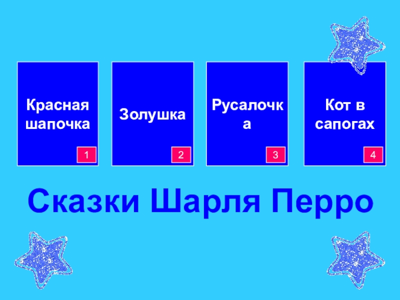 Кот в сапогахРусалочкаКрасная шапочкаЗолушка2134Сказки Шарля Перро