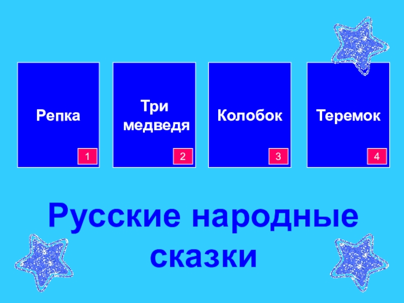 ТеремокКолобокРепкаТри медведя2134Русские народные сказки