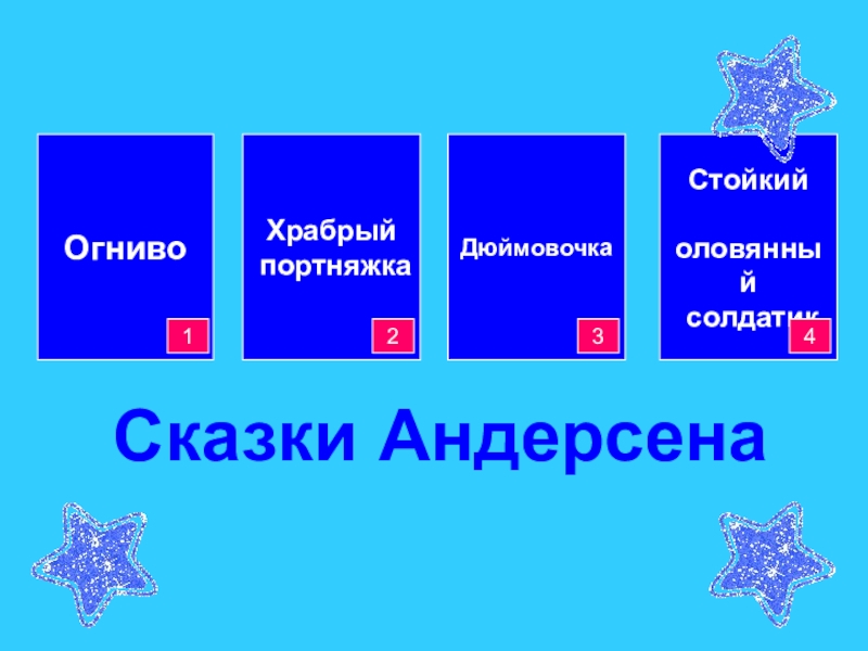 Стойкий оловянный солдатикДюймовочкаОгнивоХрабрый портняжка2134Сказки Андерсена
