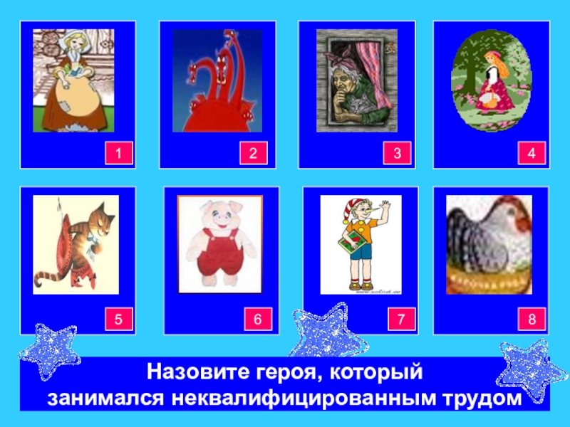 Красная ШапочкаБаба-ЯгаЗолушка34444421Кот всапогахНаф - НафБуратино8765Назовите героя, который занимался неквалифицированным трудом