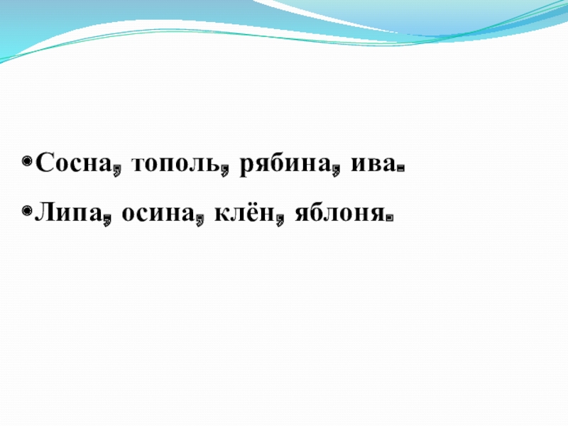 Сосна, тополь, рябина, ива. Липа, осина, клён, яблоня.
