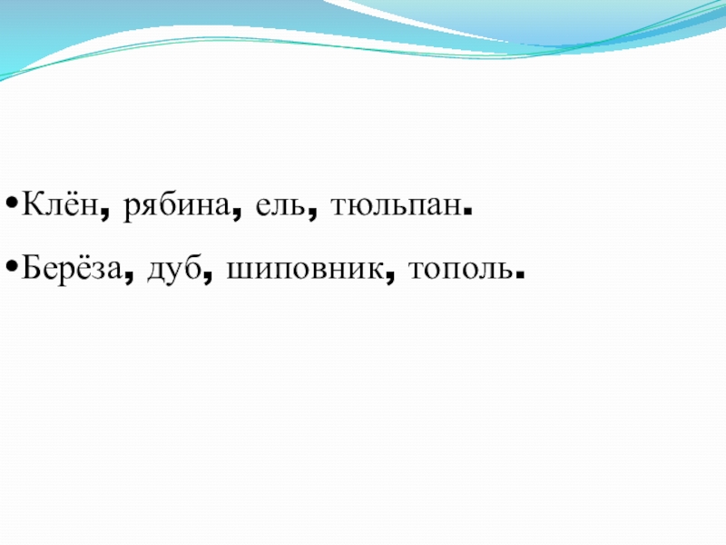 Клён, рябина, ель, тюльпан. Берёза, дуб, шиповник, тополь.