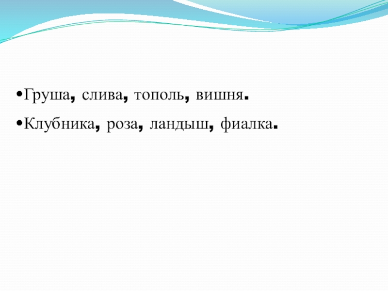Груша, слива, тополь, вишня. Клубника, роза, ландыш, фиалка.
