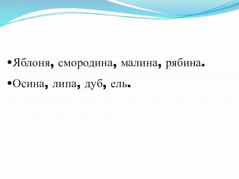 Яблоня, смородина, малина, рябина. Осина, липа, дуб, ель.