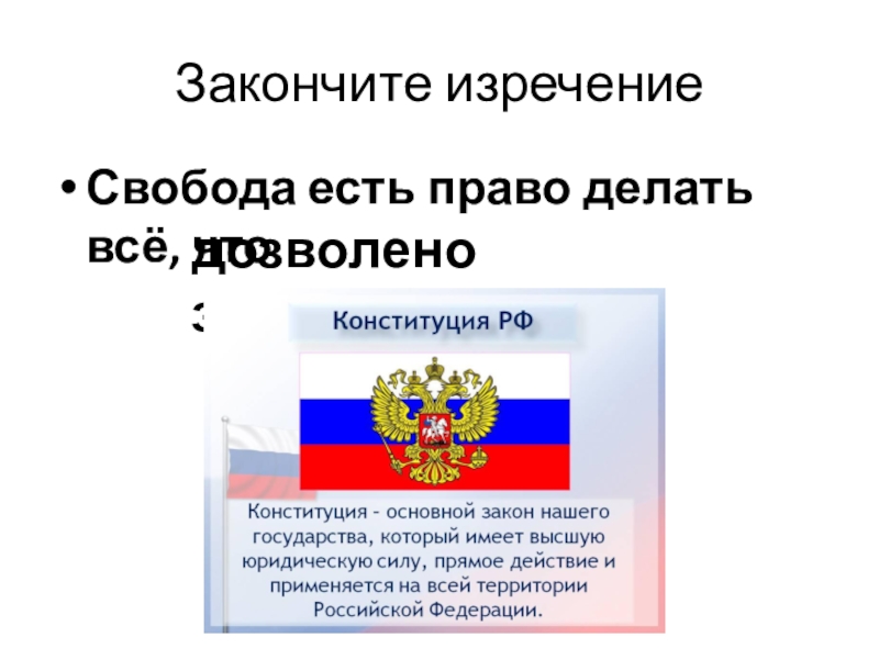 Закончите изречениеСвобода есть право делать всё, чтодозволено законом
