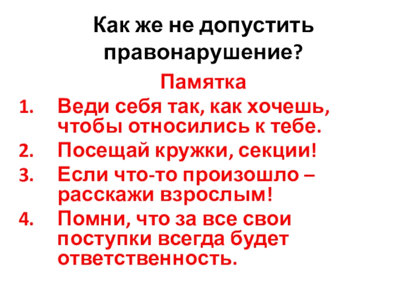 Как же не допустить правонарушение?ПамяткаВеди себя так, как хочешь, чтобы относились к тебе.Посещай кружки, секции!Если что-то произошло