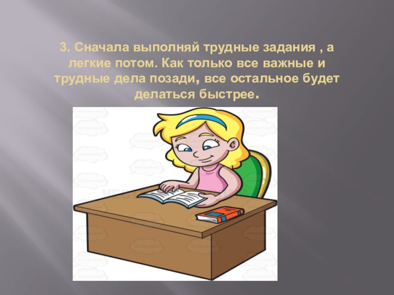 3. Сначала выполняй трудные задания , а легкие потом. Как только все важные и трудные дела позади,