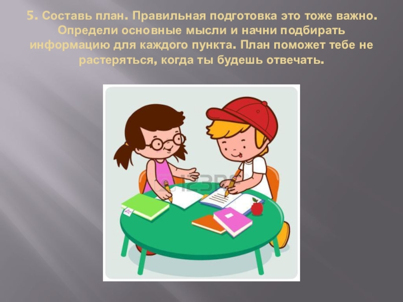 5. Составь план. Правильная подготовка это тоже важно. Определи основные мысли и начни подбирать информацию для каждого