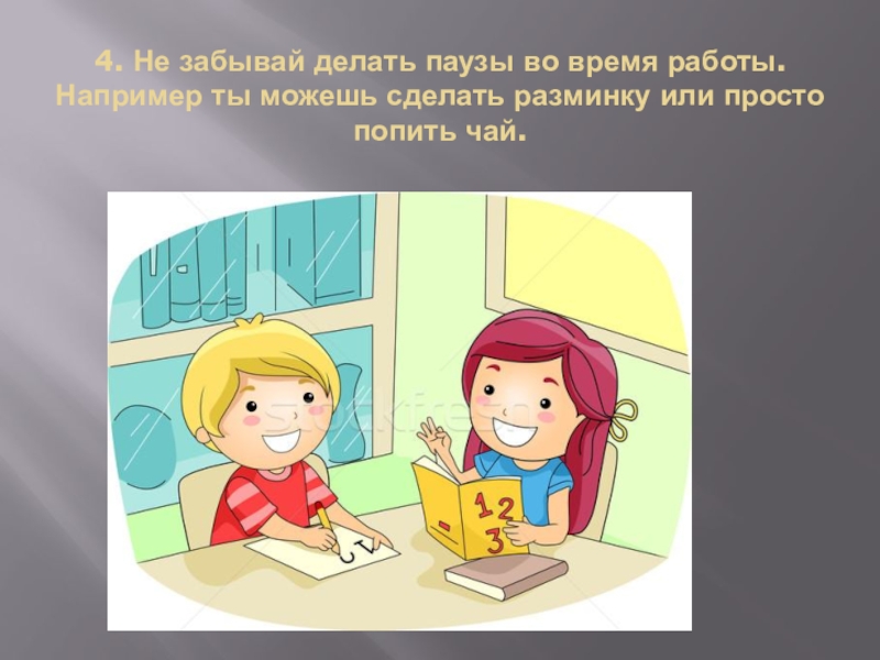4. Не забывай делать паузы во время работы. Например ты можешь сделать разминку или просто попить чай.