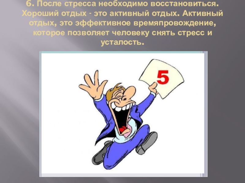 6. После стресса необходимо восстановиться. Хороший отдых - это активный отдых. Активный отдых, это эффективное времяпровождение, которое