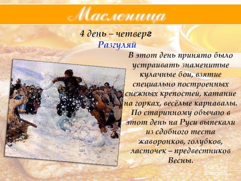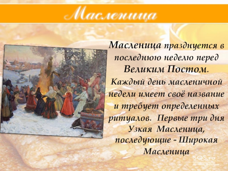 языческой Руси, настоящие проводы Зимы. Само название праздника «Масленица» произошло от того, что в этот день ели много масленой пищи.