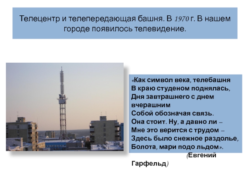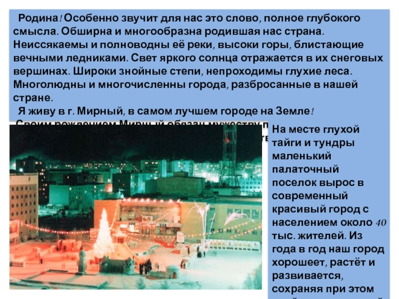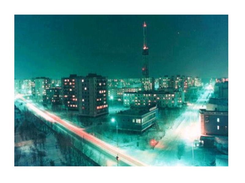 На месте глухой тайги и тундры маленький палаточный поселок вырос в современный красивый город с населением около 40 тыс. жителей. Из года в год наш город хорошеет, растёт и развивается, сохраняя при этом свой неповторимый облик. И я, надеюсь, что ,когда вырасту, внесу свой вклад в развитие города!