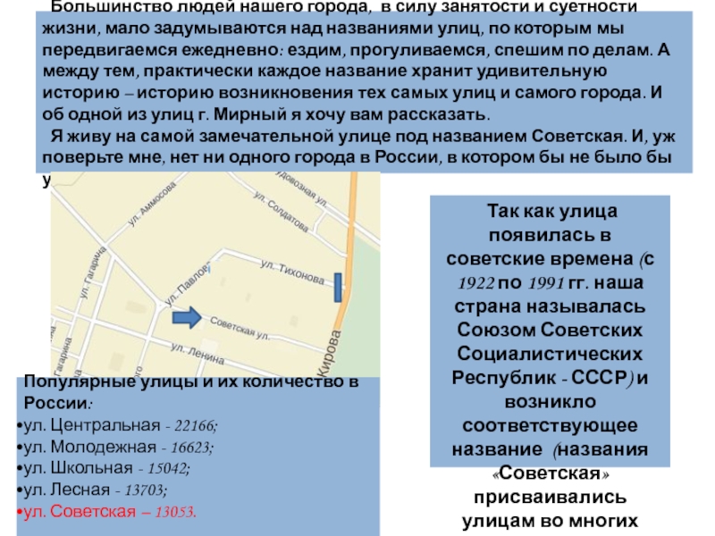Так как улица появилась в советские времена (с 1922 по 1991 гг. наша страна называлась Союзом Советских Социалистических Республик - СССР) и возникло соответствующее название (названия «Советская» присваивались улицам во многих городах Советского Союза).
