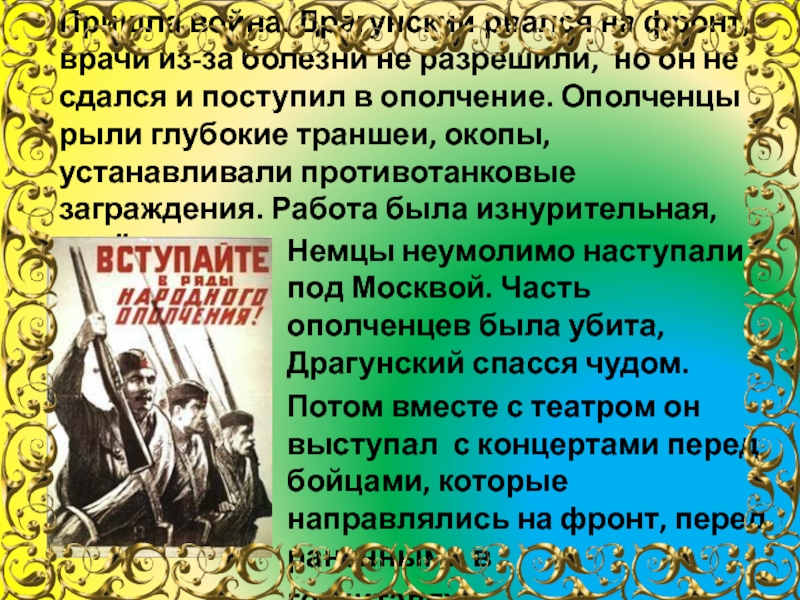 Немцы неумолимо наступали под Москвой. Часть ополченцев была убита, Драгунский спасся чудом.