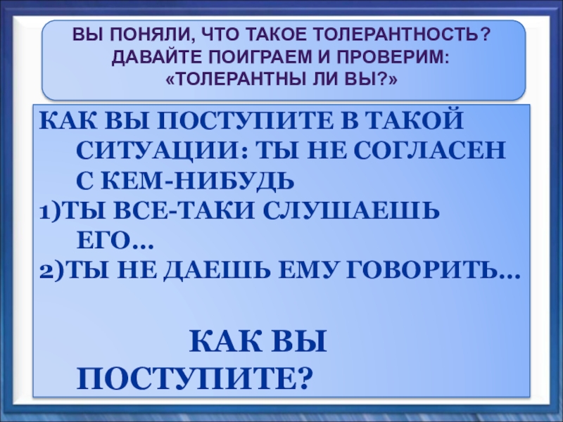 ВЫ ПОНЯЛИ, ЧТО ТАКОЕ ТОЛЕРАНТНОСТЬ? ДАВАЙТЕ ПОИГРАЕМ И ПРОВЕРИМ: «ТОЛЕРАНТНЫ ЛИ ВЫ?»