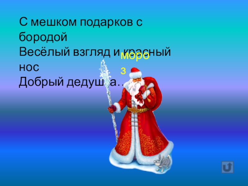 С мешком подарков с бородойВесёлый взгляд и красный носДобрый дедушка…