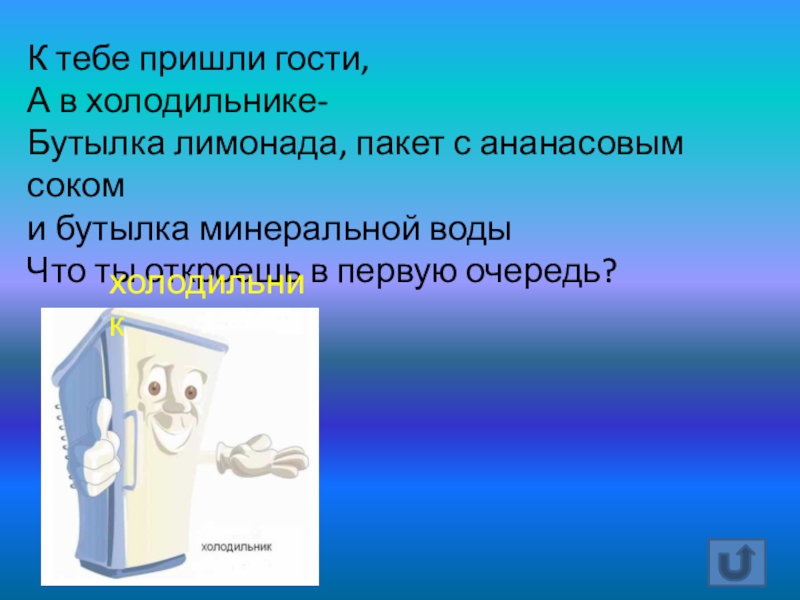 К тебе пришли гости,А в холодильнике-Бутылка лимонада, пакет с ананасовым соком и бутылка минеральной водыЧто ты откроешь