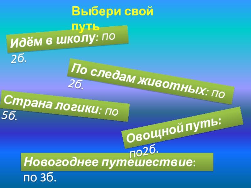 Страна логики: по 5б.Новогоднее путешествие: по 3б.По следам животных: по 2б.Идём в школу: по 2б.Выбери свой путьОвощной