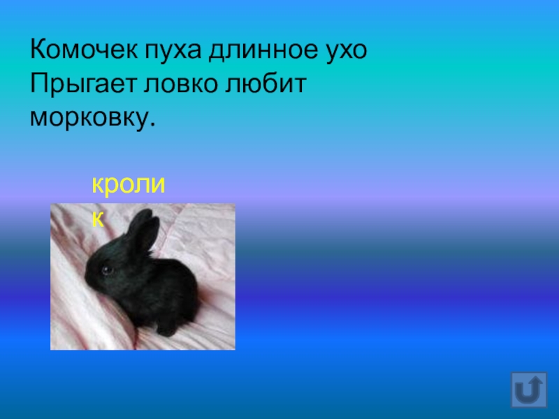 Комочек пуха длинное ухоПрыгает ловко любит морковку.
