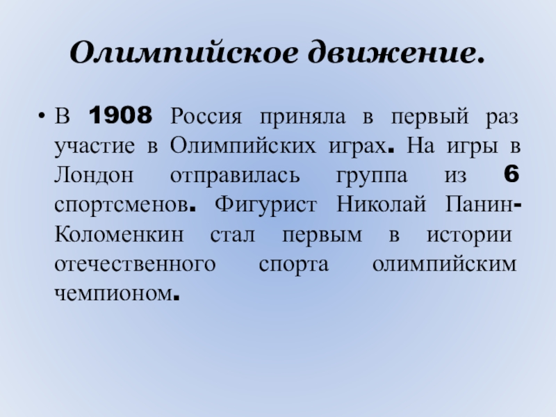 Олимпийское движение.В 1908 Россия приняла в первый раз участие в Олимпийских играх. На игры в Лондон отправилась