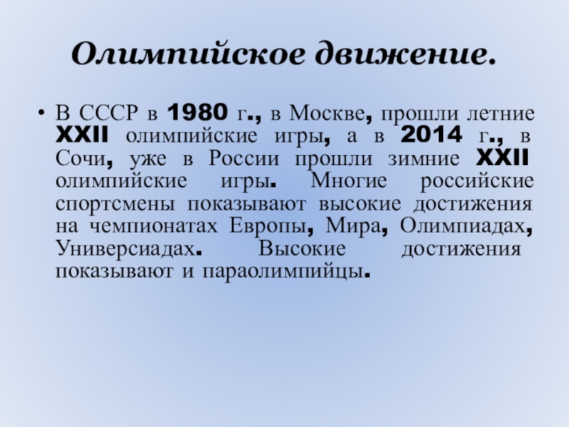 Олимпийское движение.В СССР в 1980 г., в Москве, прошли летние XXII олимпийские игры, а в 2014 г.,