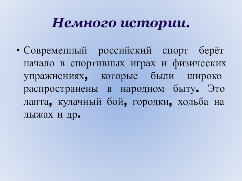 Немного истории.Современный российский спорт берёт начало в спортивных играх и физических упражнениях, которые были широко распространены в народном быту. Это лапта, кулачный бой, городки, ходьба на лыжах и др.