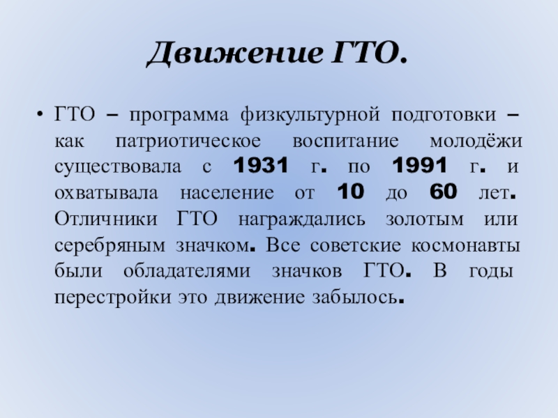 существовала с 1931 г. по 1991 г. и охватывала население от 10 до 60 лет. Отличники ГТО награждались золотым или серебряным значком. Все советские космонавты были обладателями значков ГТО. В годы перестройки это движение забылось.