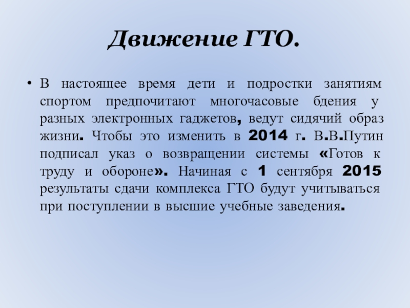бдения у разных электронных гаджетов, ведут сидячий образ жизни. Чтобы это изменить в 2014 г. В.В.Путин подписал указ о возвращении системы «Готов к труду и обороне». Начиная с 1 сентября 2015 результаты сдачи комплекса ГТО будут учитываться при поступлении в высшие учебные заведения.
