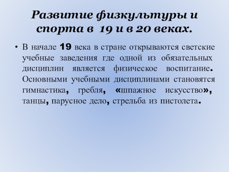 Развитие физкультуры и спорта в 19 и в 20 веках.В начале 19 века в стране открываются светские