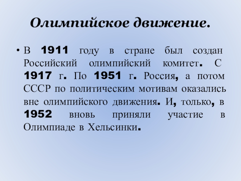 Олимпийское движение.В 1911 году в стране был создан Российский олимпийский комитет. С 1917 г. По 1951 г.