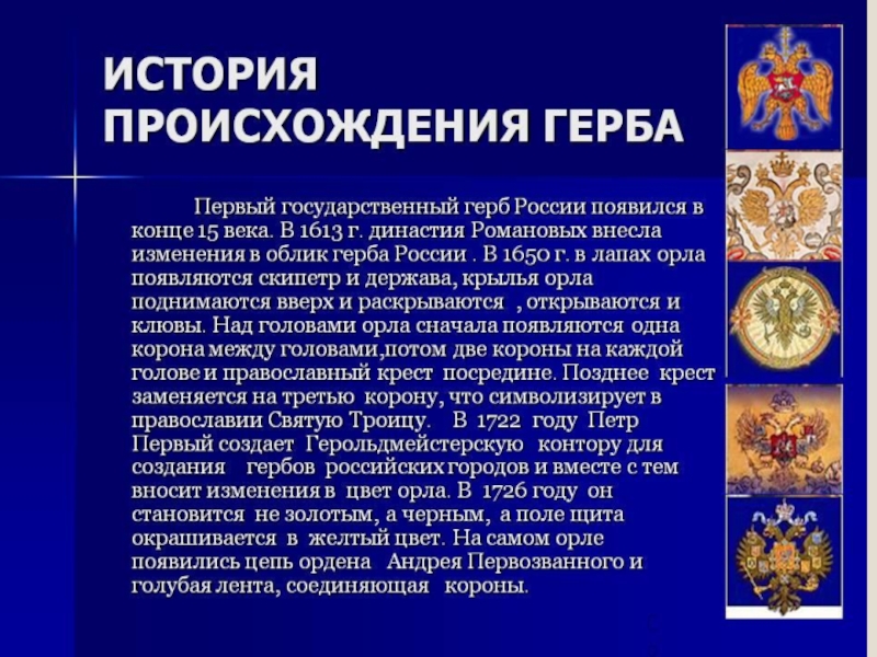 на рубеже XVII‑XVIII веков, в эпоху становления России как мощного государства. Впервые бело‑сине‑красный флаг был поднят на первом русском военном корабле "Орел", в царствование отца Петра I Алексея Михайловича. Законным же "отцом" триколора признан Петр I. 20 января 1705 года он издал указ, согласно которому "на торговых всяких судах" должны поднимать бело‑сине‑красный флаг, сам начертал образец и определил порядок горизонтальных полос.