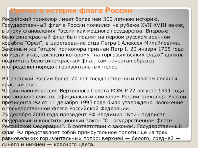 25 декабря 2000 года президент РФ Владимир Путин подписал федеральный конституционный закон "О Государственном флаге Российской Федерации". В соответствии с законом, Государственный флаг РФ представляет собой прямоугольное полотнище из трех равновеликих горизонтальных полос: верхней — белого, средней — синего и нижней — красного цвета.