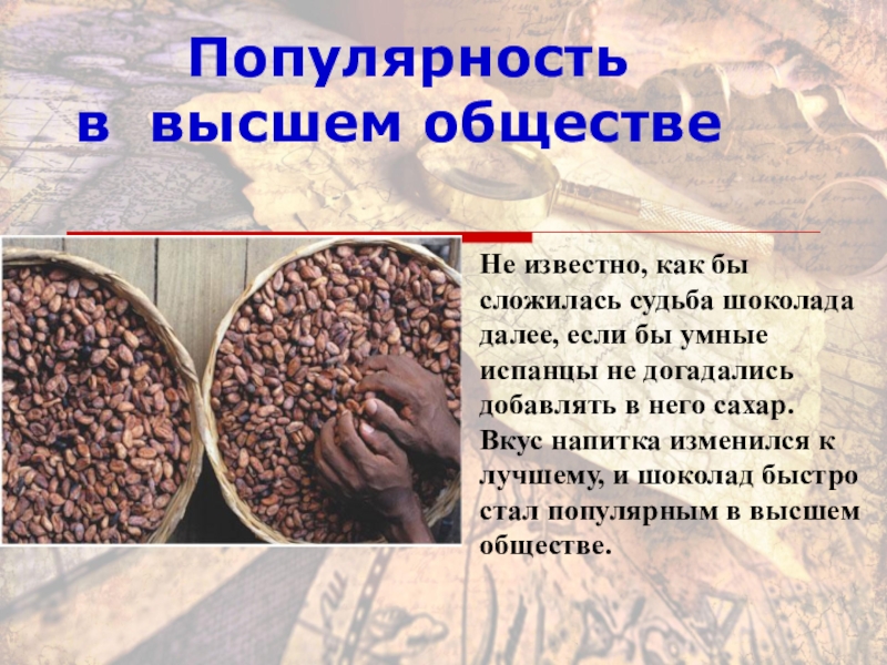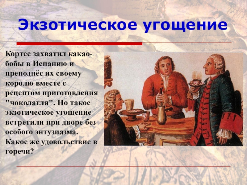 Экзотическое угощениеКортес захватил какао-бобы в Испанию и преподнёс их своему королю вместе с рецептом приготовления