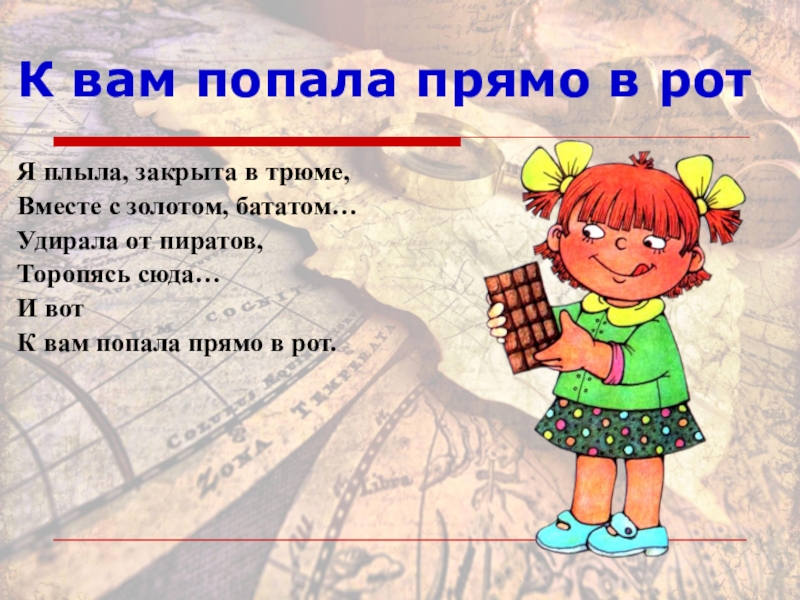 К вам попала прямо в ротЯ плыла, закрыта в трюме, Вместе с золотом, бататом… Удирала от пиратов,