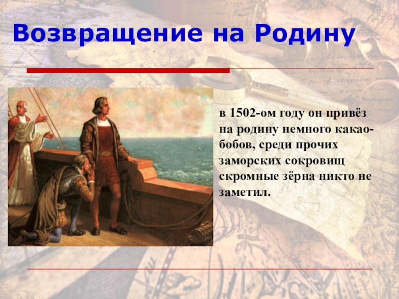 Возвращение на Родинув 1502-ом году он привёз на родину немного какао-бобов, среди прочих заморских сокровищ скромные зёрна