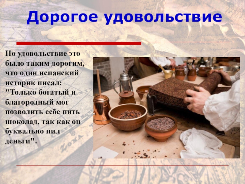 писал: "Только богатый и благородный мог позволить себе пить шоколад, так как он буквально пил деньги".