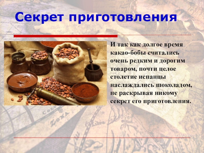 Секрет приготовленияИ так как долгое время какао-бобы считались очень редким и дорогим товаром, почти целое столетие испанцы