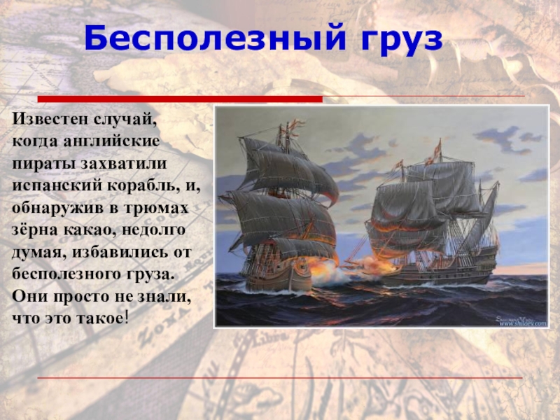 Бесполезный грузИзвестен случай, когда английские пираты захватили испанский корабль, и, обнаружив в трюмах зёрна какао, недолго думая,