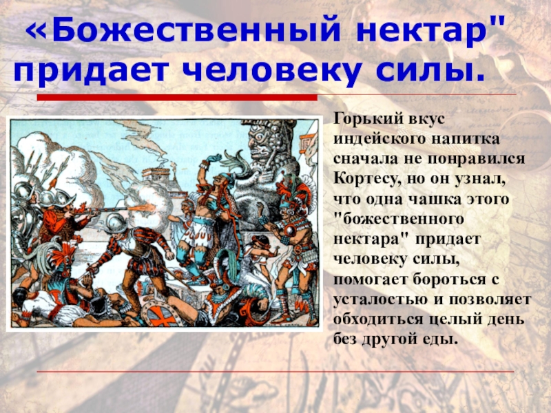 понравился Кортесу, но он узнал, что одна чашка этого "божественного нектара" придает человеку силы, помогает бороться с усталостью и позволяет обходиться целый день без другой еды.