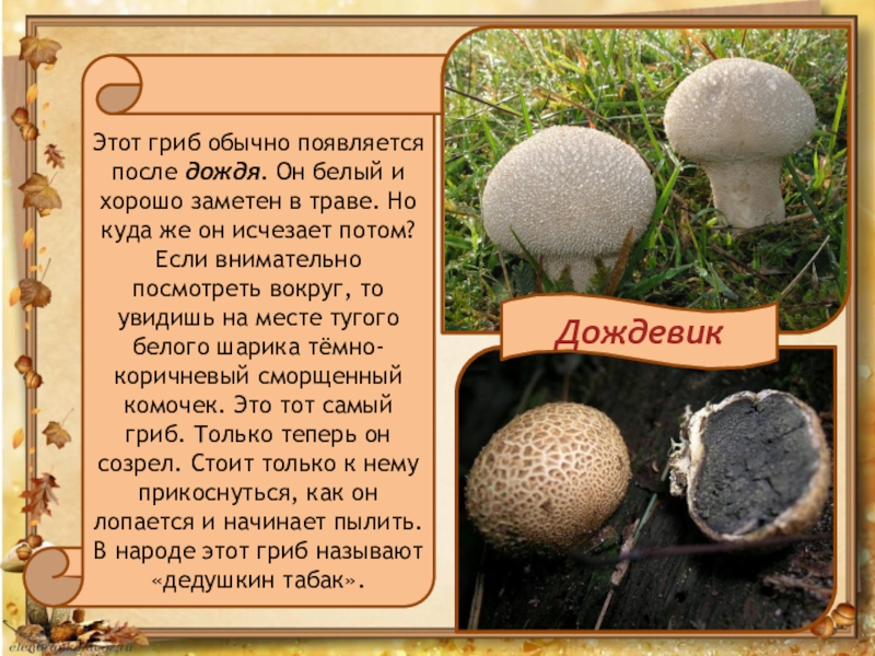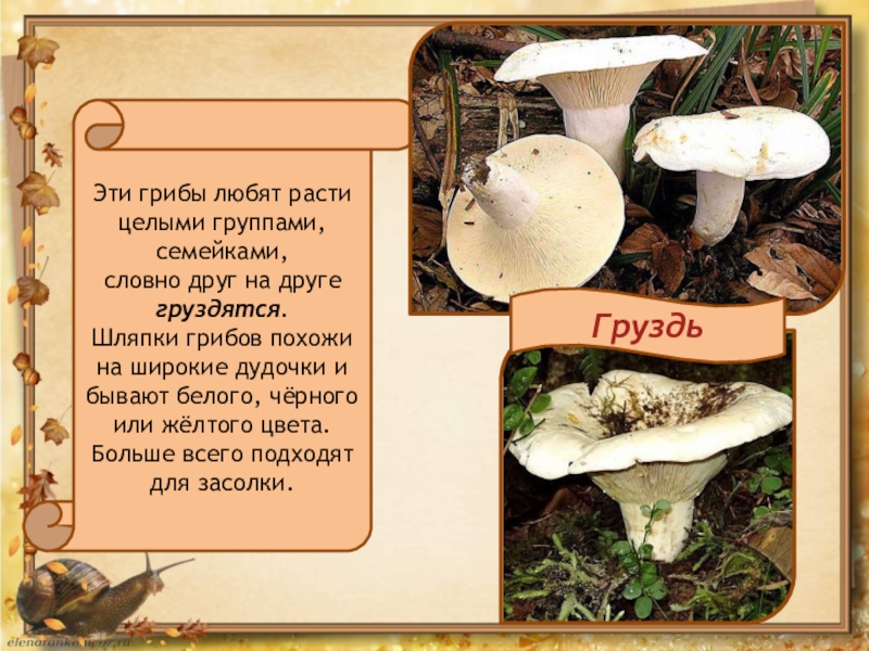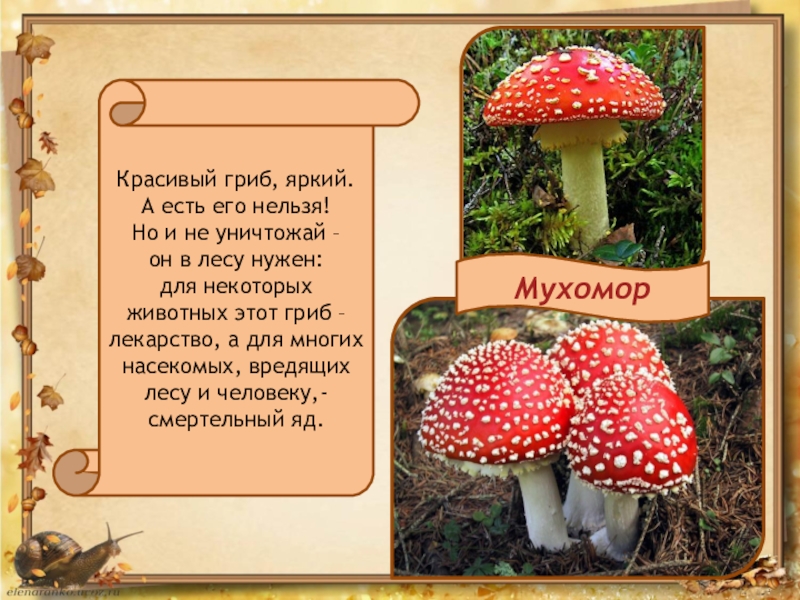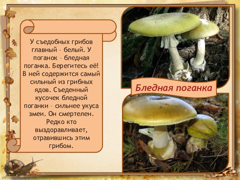 У съедобных грибов главный – белый. У поганок – бледная поганка. Берегитесь её! В ней содержится самый сильный из грибных ядов. Съеденный кусочек бледной поганки – сильнее укуса змеи. Он смертелен. Редко кто выздоравливает, отравившись этим грибом.